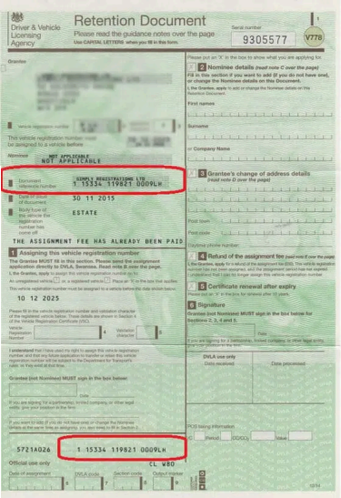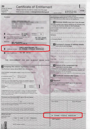 ● a number plate authorisation certificate (V948) with an official stamp from the Driver and Vehicle Licensing Agency (DVLA)
